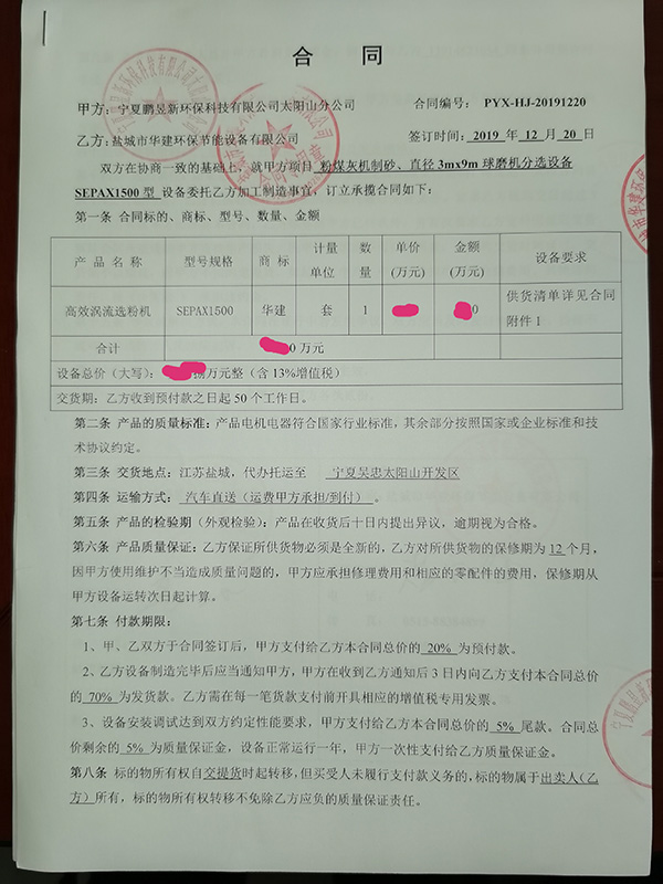 我司三年后與老客戶(hù)寧夏鵬昱新環(huán)??萍加邢薰驹俅魏献魑宜拘滦透咝u流選粉機(jī)SEPAX1500型,配套直徑3.0米球磨機(jī)使用。